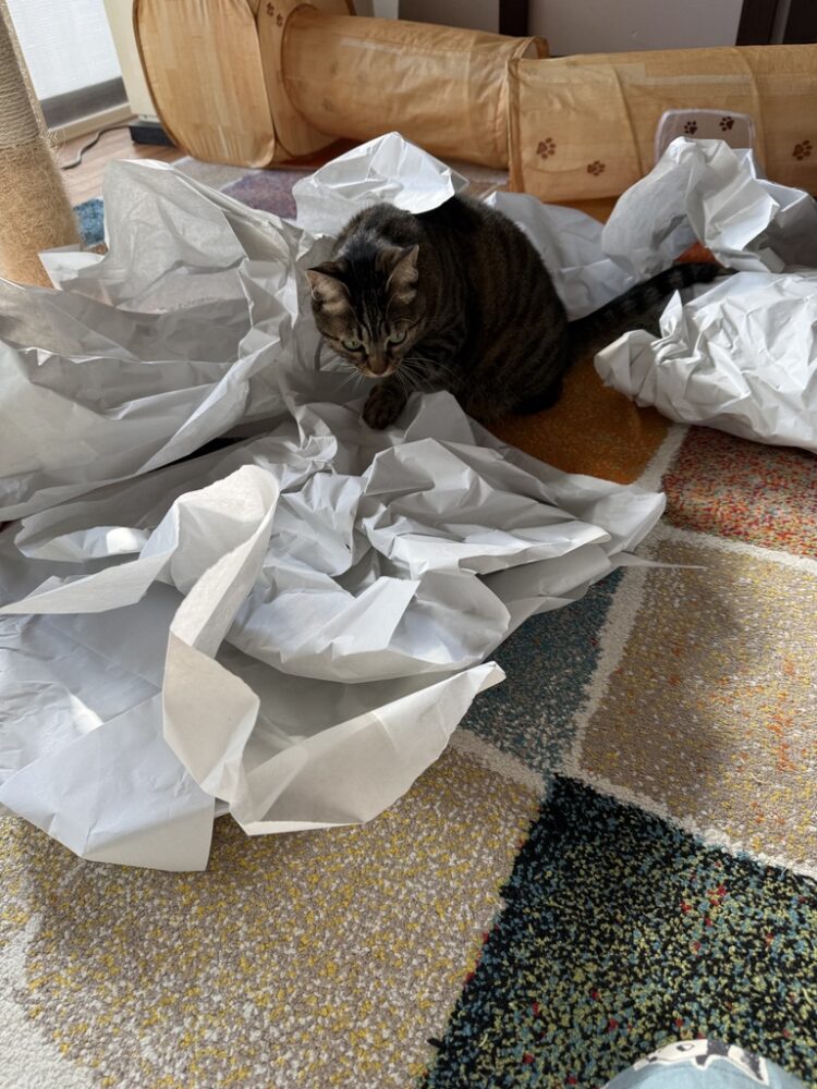 ねこちゃんは新しいものなんでも気になって遊びます。ガサガサ音が気に入ったようで何度突進して楽しんでいました。